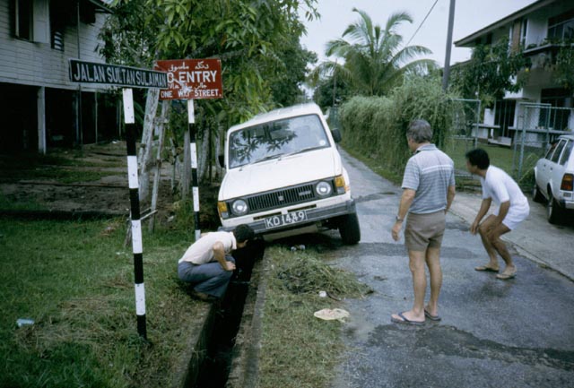Left: I think I may have parked this vehicle the previous evening. Tricky things those storm drains. Taff supervises its extrication.