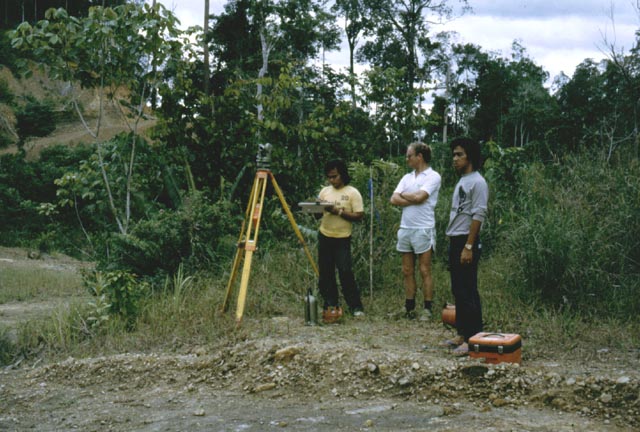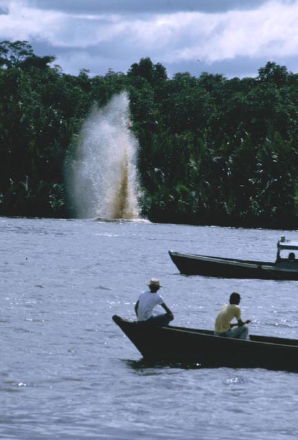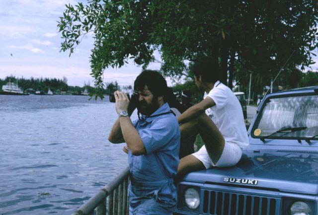 Shooting across the Belait River. Jim Plaice and Dave Jones (Bird-dog) site-seeing.