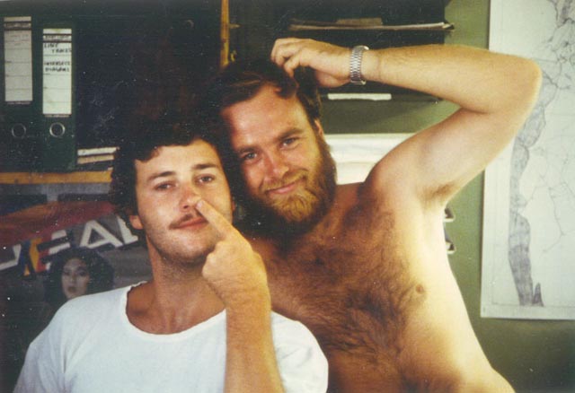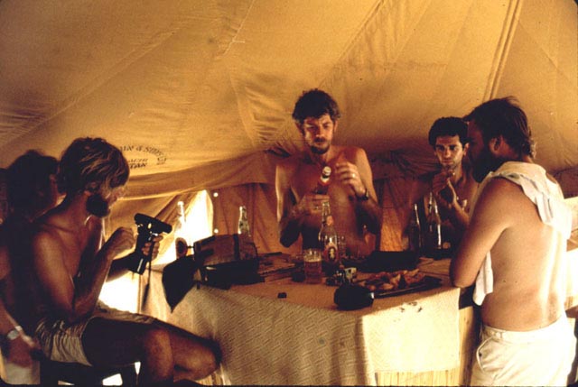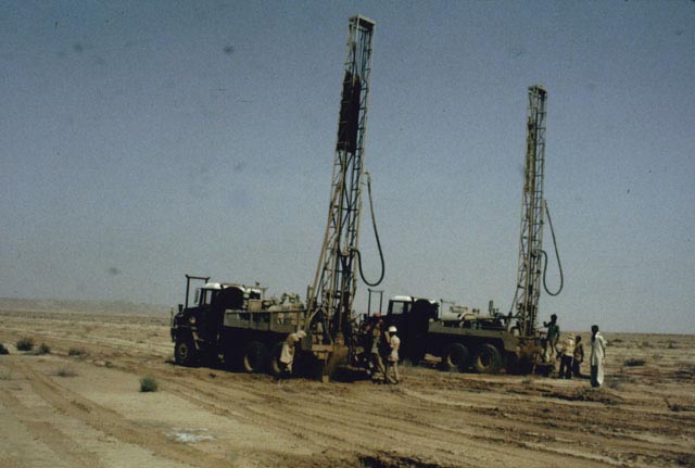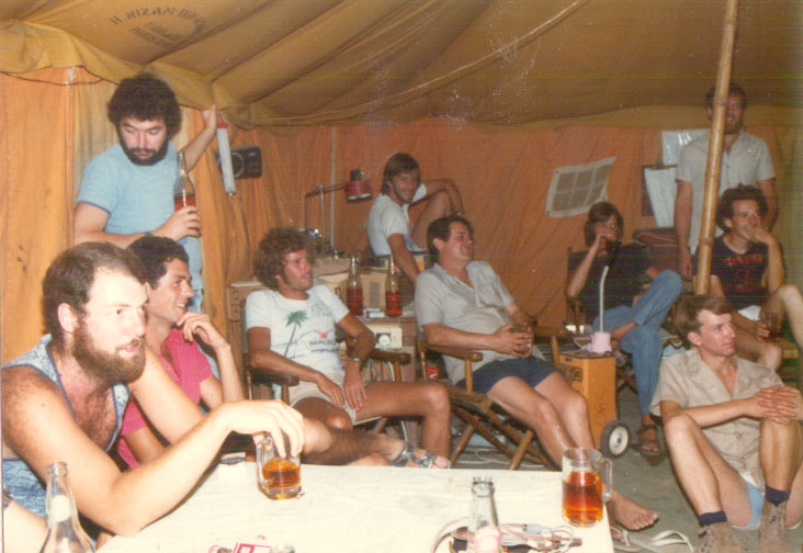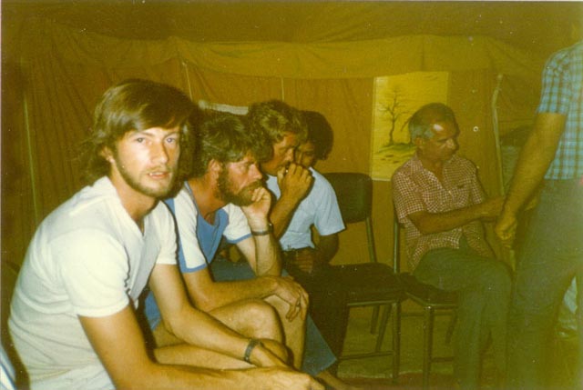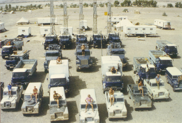 This is a great picture and marks the changeover from Shell Vibroseis to BP Drilling/dynamite; 098 to 177. Note the presence of both Vibs and Rigs. The picture was taken by Tony Cheshire from the top of another rig. The party chief at this time (in the centre) was Boyo (Geoff Davies). Also in this picture, not previously mentioned, are Scipio Brook and John Halliday.